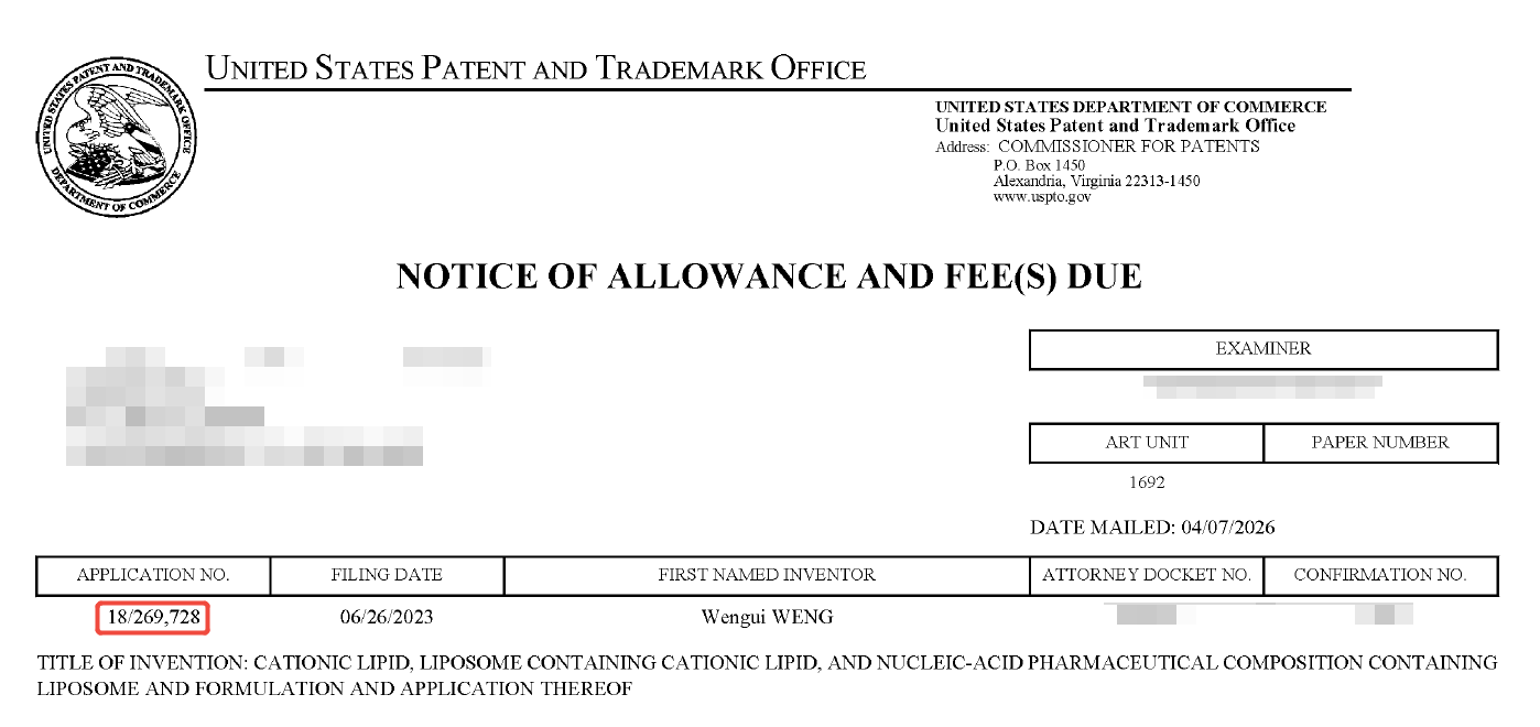 Tri-Regional Authorization! Sinopeg’s DHA-1 Series Cationic Lipids Receive U.S. Patent Allowance with Markush Formula April 14,2026.